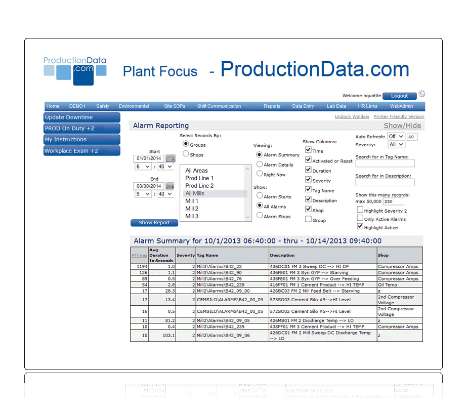 Alarm summaries are available to be reviewed for any time period, providing the number of times each alarm occurred and the average duration of each event during the selected time period.