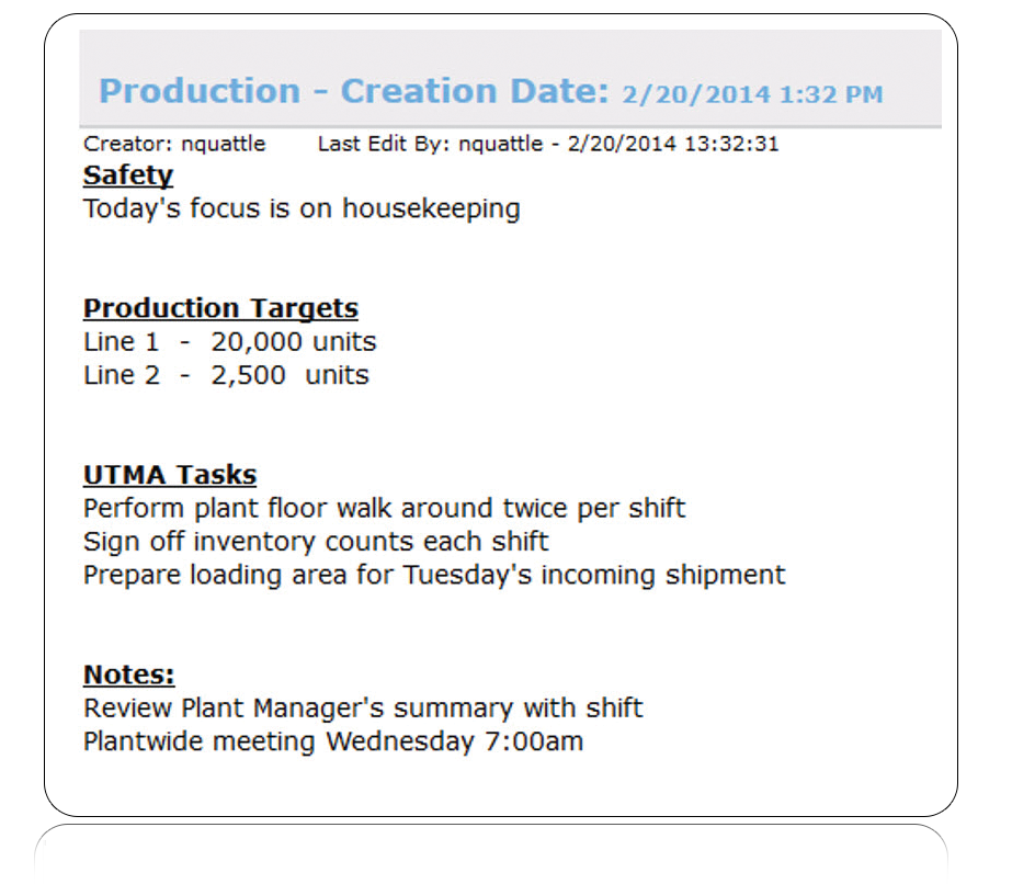 Collecting shift reports in log books or spreadsheets and losing time transferring data from logs to reports is inefficient and a thing of the past. Employers want to capitalize on the knowledge of employees within a plant. Management wants to provide clear communication and instructions between departments even in rotating shift environments.